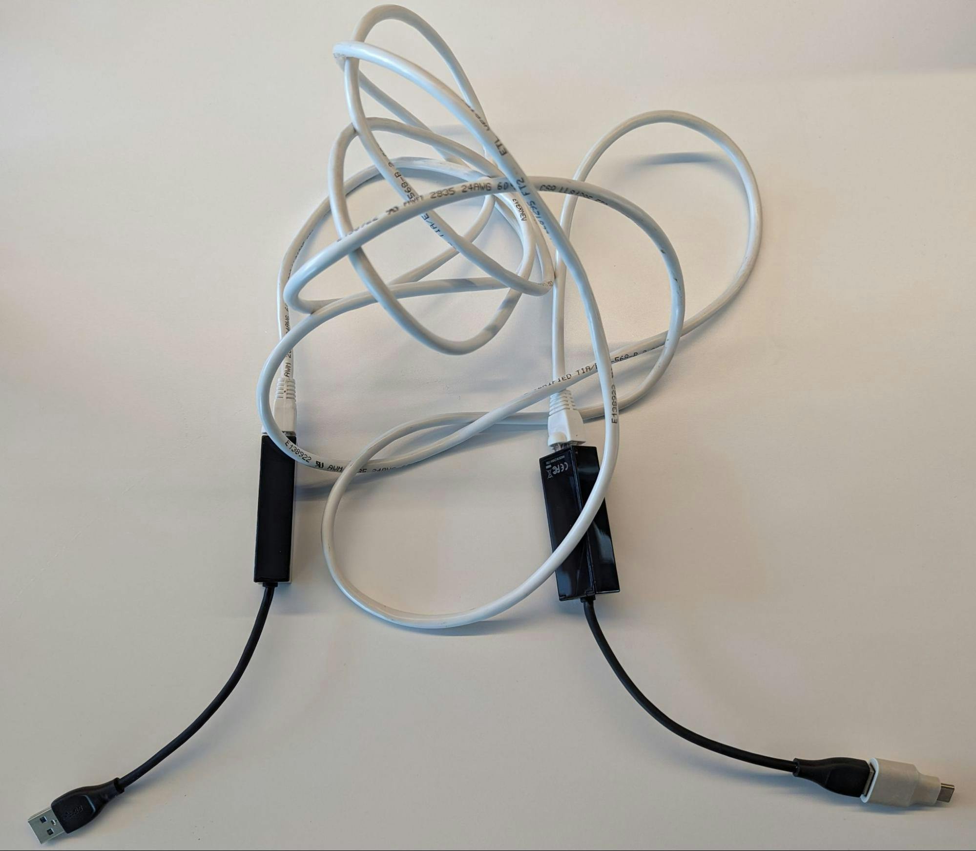 A complete ADB over Ethernet setup including USB-A Ethernet dongle, CAT6 Ethernet cable, USB-A Ethernet dongle, and USB-A to USB-C adapter.